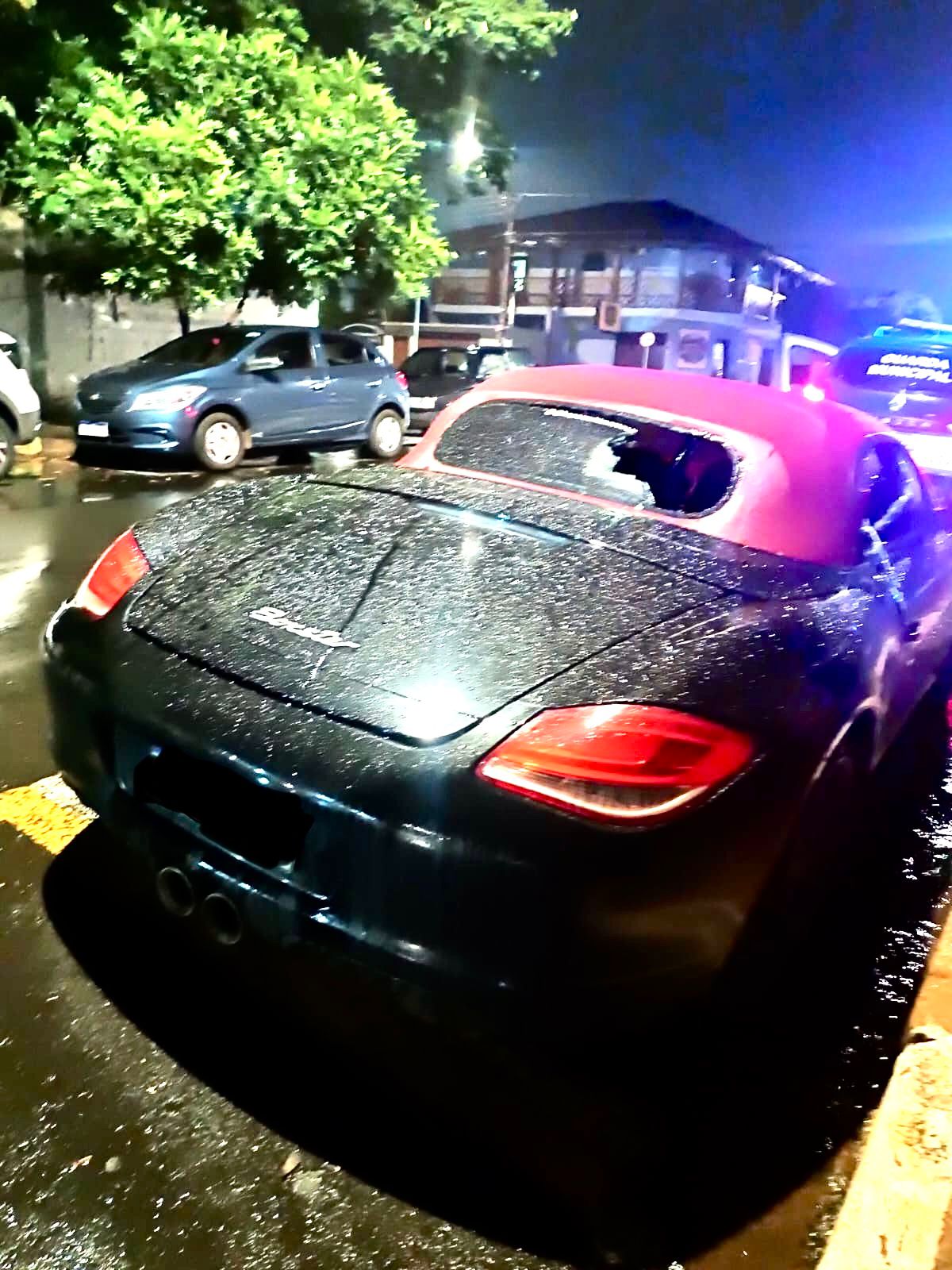 Um Porsche foi vandalizado na noite desta terça-feira (09) quando estava estacionado em frente ao salão social do Cosmopolitano Futebol Clube; no local, acontecia a formatura de uma escola particular da cidade. Ninguém ficou ferido.