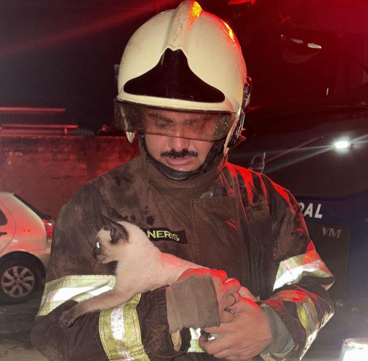 No momento do combate às chamas, uma imagem chamou a atenção: um gato foi resgatado de dentro da casa por um agente da Defesa Civil. O felino foi entregue à proprietária da casa.