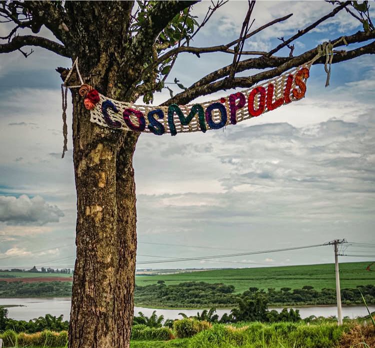 Numa árvore, em uma área gramada, próxima as ruas doutor Moacir Costa Couto e Portugal, surgiu uma faixa de crochê, de aproximadamente 1 metro, que com letras coloridas escreve Cosmópolis.